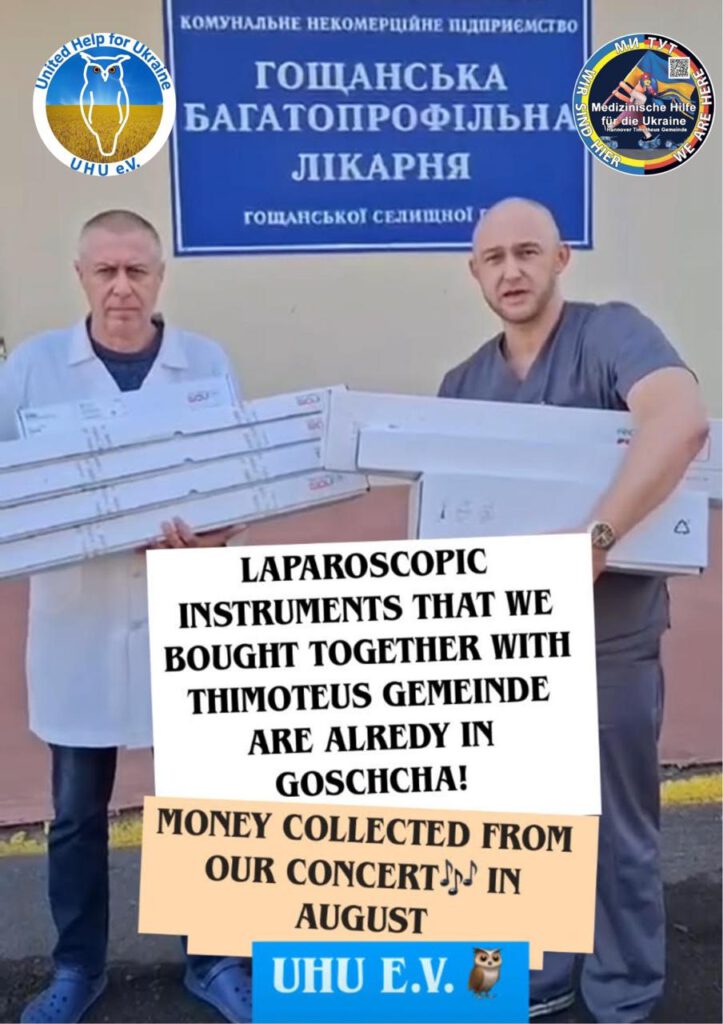 UHU e.V. konnte den Projektpartnern in Hannover bei der Finanzierung helfen. Durch Ihre Spenden und den Erlös des Benefizkonzertes konnten wir 3.000 € beisteuern. Damit konnten die Geräte beschafft werden. Sie sind bereits in der Ukraine und in Hoschtscha im Einsatz. Dieses Projekt ist einmal mehr echte UNITED Help for Ukraine gewesen. Danke allen Unterstützerinnen und Unterstützern!
